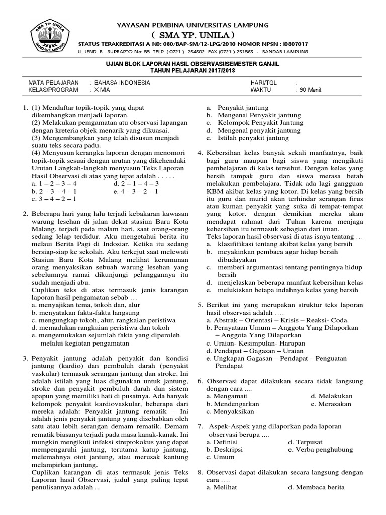 2 ę„å soal soal pts kelas 2 semester 2 genap yang kami bagikan merupakan soal kurikulum 2013 yang berbentuk mata pelajaran dan telah dilengkapi dengan kunci jawaban dan kisi kisi soal. On saturday night we went to the town hall. Ciri ciri kebahasaan teks laporan hasil observasi brainly co id. Terumbu karang ini hidup di pantai atau daerah yang terkena sinar matahari dan hidup di perairan yang berada kurang lebih lima puluh meter di bawah permukaan air laut dengan suhu tertentu, serta di air jernih yang tidak terkena polusi. Contoh soal pilihan ganda teks laporan hasil observasi lho dan jawabannya hallo adik adik semua bagaimana kabarnya.